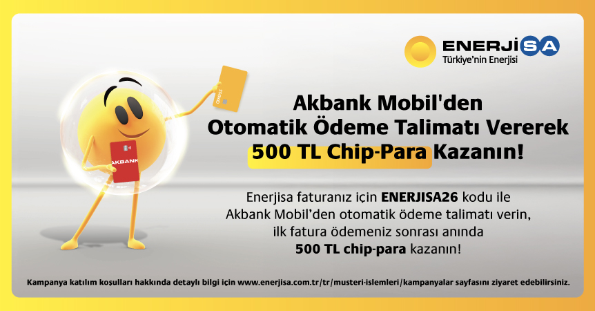 akbank.com/davetet linki üzerinden Akbank Mobil’e giriş yaparak ENERJISA26 kodu ile Enerjisa faturanıza otomatik ödeme talimatı verin, ilk fatura ödemeniz sonrası anında 500 TL chip-para kazanın!